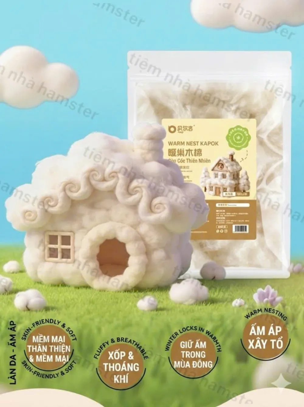* 100% Tự nhiên: Sợi gòn cây tự nhiên, không hóa chất, cực kỳ an toàn cho làn da nhạy cảm của Hamster.