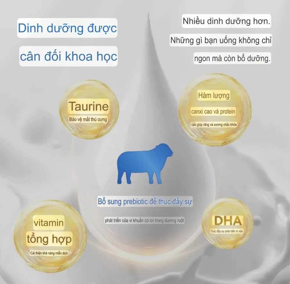 Thành phần: Bột sữa dê nguyên chất, bột whey protein,fructooligosaccharides,galactooligosaccharides, α-galactosidase, vitamin A, vitamin D3, vitamin E, thiamine hydrochloride (vitamin B1),riboflavin(vitamin B2), pyridoxine hydrochloride (vitamin B6) cyanocobalamin (vitamin B12), taurine, niacin, axit folic, D-canxi pantothenate, axit docosahexaenoic (DHA)