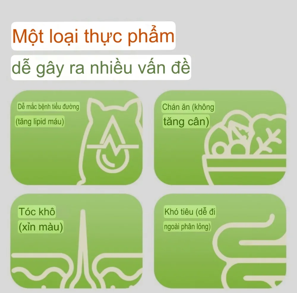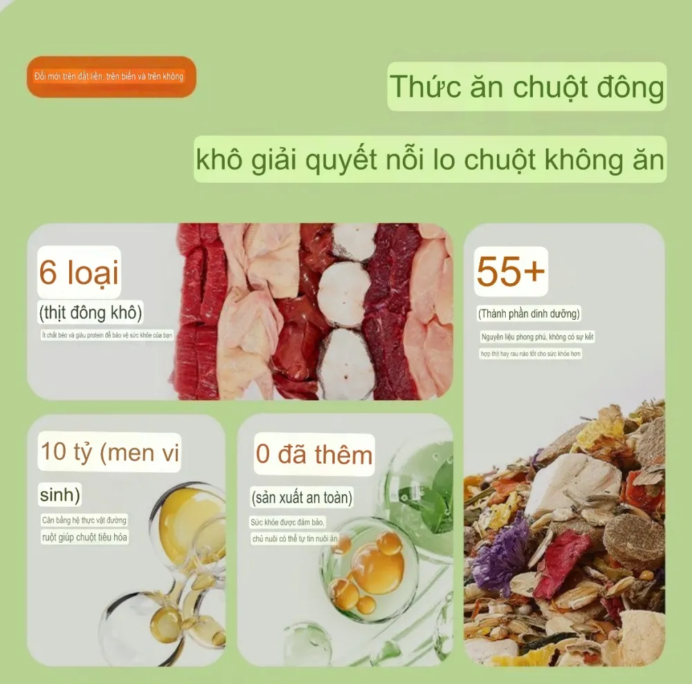 Thành phần: Gạo, lúa mì, lúa mạch, kiều mạch, yến mạch, hạt kê, hạt lanh, kê ngũ sắc, đậu xanh, cao lương đỏ, đậu xanh, ngô, bắp cải khô, cà rốt thái hạt lựu, thân xanh khô, khoai lang tím khô, cao lương trắng, hạt ý dĩ, đậu vàng, hạt đậu phộng, hạt chia, lá bạc hà, dưa chuột thái hạt lựu, táo thái hạt lựu, hạt ý dĩ, hạt cỏ cà ri, hạt bí ngô đã bóc vỏ, hạt cỏ linh lăng, hạt cây rum, hạt tía tô, hạt cà rốt, hạt rau bina, hạt thanh lương trà, hạt cỏ lúa mạch đen, hạt cải dầu, hạt cúc vạn thọ, kim ngân hoa, cánh hoa lưu ly, bồ công anh, hoa nhài, thịt nai đông lạnh, cá tuyết đông lạnh, thịt bồ câu đông lạnh, gà đông lạnh, thịt bò đông lạnh, gan gà đông lạnh, nhộng tằm, sâu lúa mạch, sâu bột, hoa hồng, cánh hoa mận đỏ, cúc vạn thọ hoa, hạt diêm mạch, củ cải đường, hạt nướng (bột đậu nành lên men, bột sữa dê, đậu nành phồng, tinh bột, vitamin, axit amin, đậu xanh, hạt vừng, gạo),Probiotics