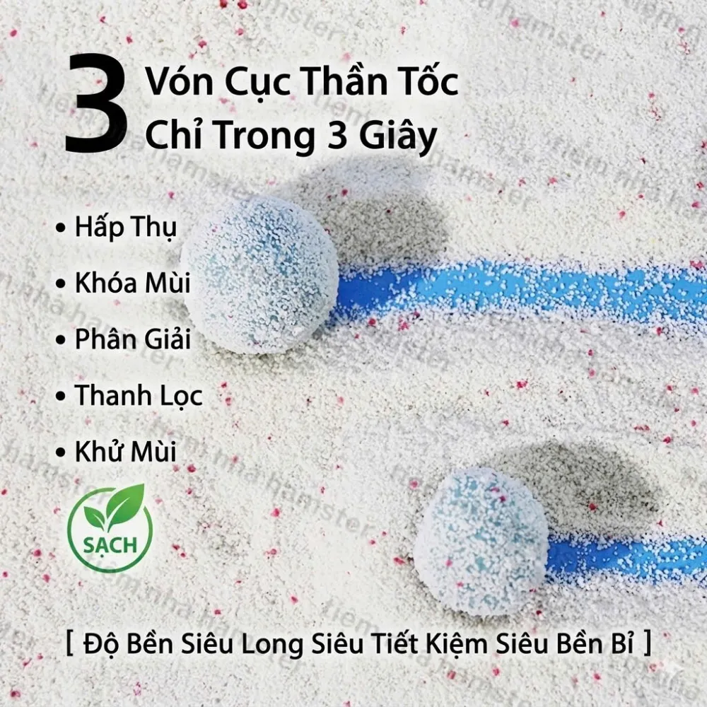 Sự kết hợp hoàn hảo giữa 98% cát sắn tự nhiên và 2% hạt khử mùi Sakura. Vừa dùng làm cát vệ sinh, vừa dùng làm cát tắm, cực kỳ tiện lợi!