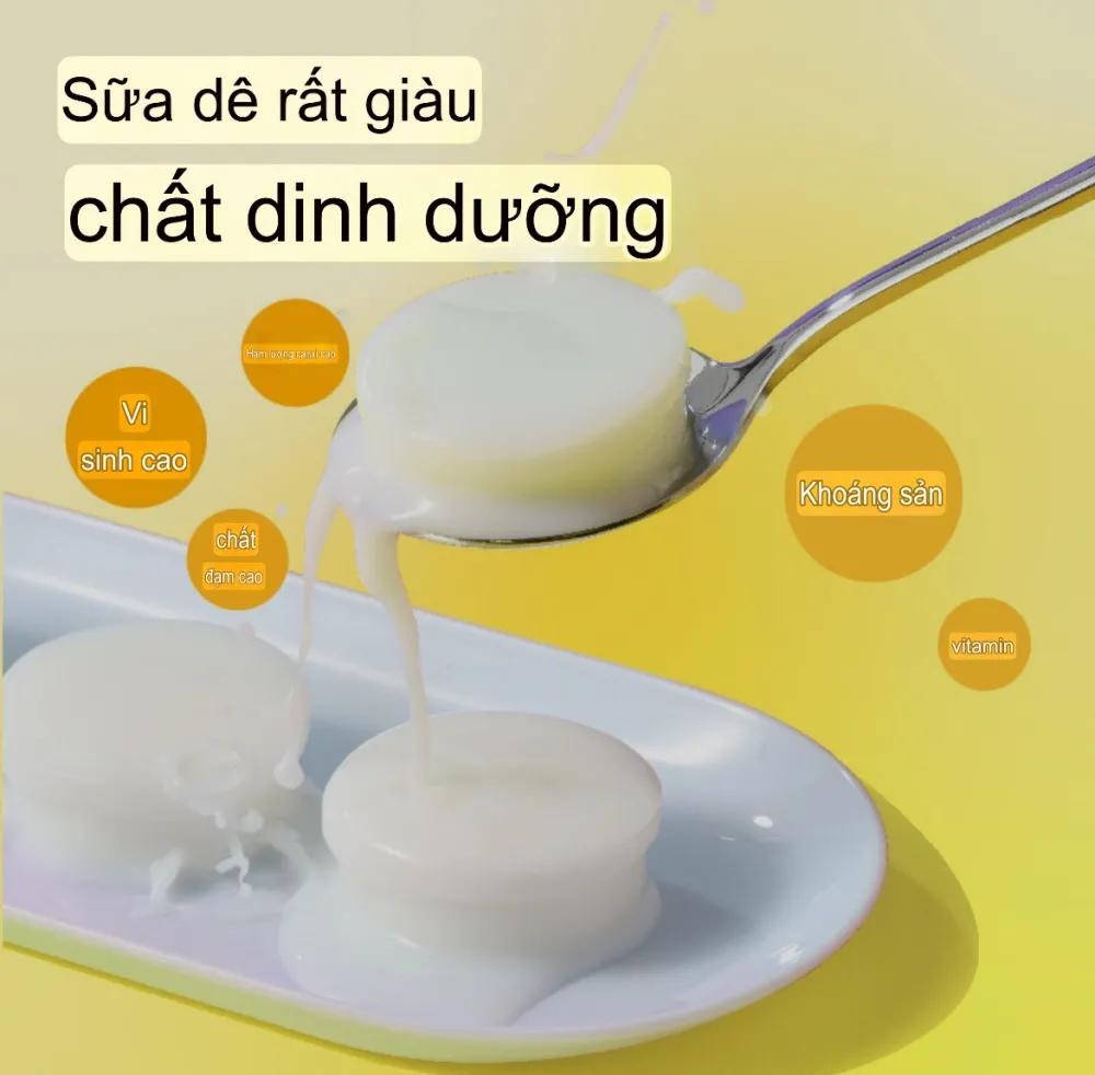 Thành phần: nước, si-rô fructose, trehalose, bột sữa dê 15%,nước táo 5%, bột konjac.
