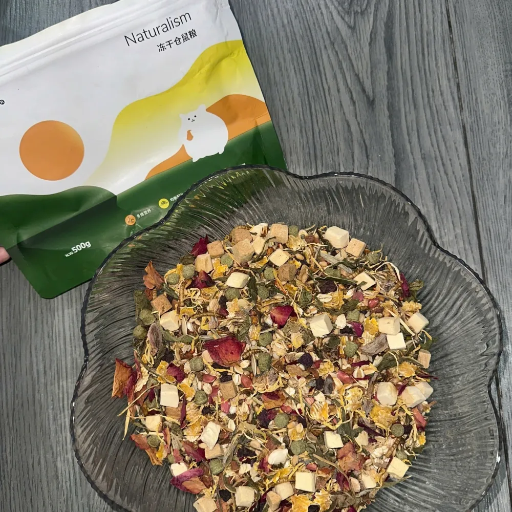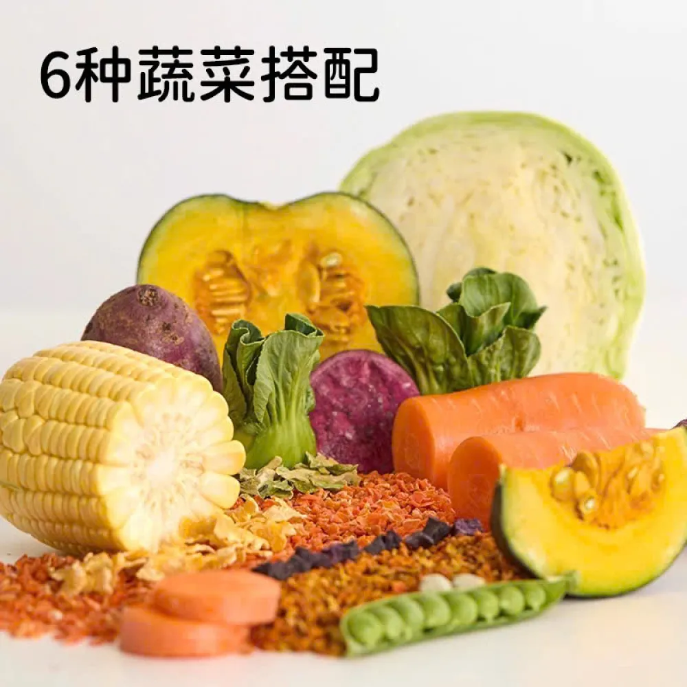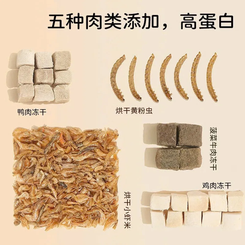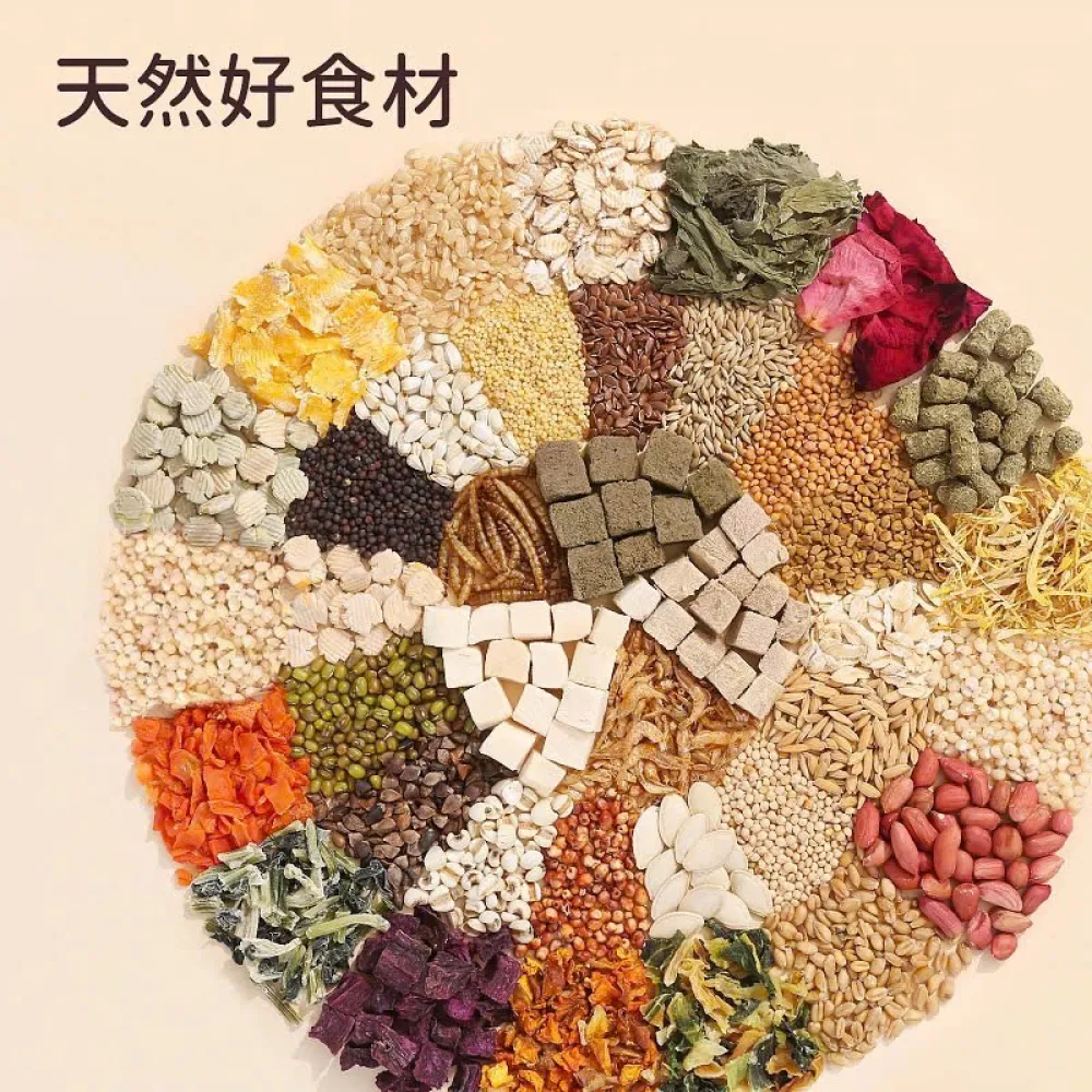 Thành phần: Kiều mạch vỏ, lúa mì tách vỏ, bột yến mạch, lúa mạch mảnh, lúa miến trắng, gạo nâu, kê trắng, kê vàng, kê vỏ, gạo tách vỏ, lúa miến đỏ, đậu xanh, hạt lúa mạch, mảnh ngô, mảnh đậu vàng, lát đậu xanh, nhỏ hạt đậu phộng đỏ, hạt bí ngô nguyên vỏ, hạt rum đã bóc vỏ, cỏ timothy, cánh hoa cúc hoàng gia, hoa hồng, bồ công anh, hạt cải dầu, hạt lanh có vỏ, hạt hoàng yến, hạt cỏ cà ri, khối gà đông lạnh, khối thịt vịt đông khô, m-Rau bina sấy lạnh , thịt bò viên, tôm sấy, giun sấy, ớt chuông , bắp cải , cà rốt , bí đỏ , khoai lang tím sấy.
