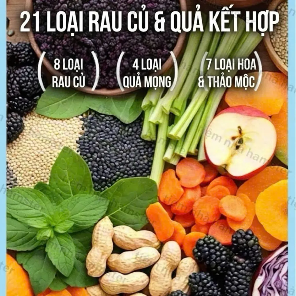 21 loại trái cây và rau quả: 8 loại rau củ , 4 loại mọng , 7 loại trái cây