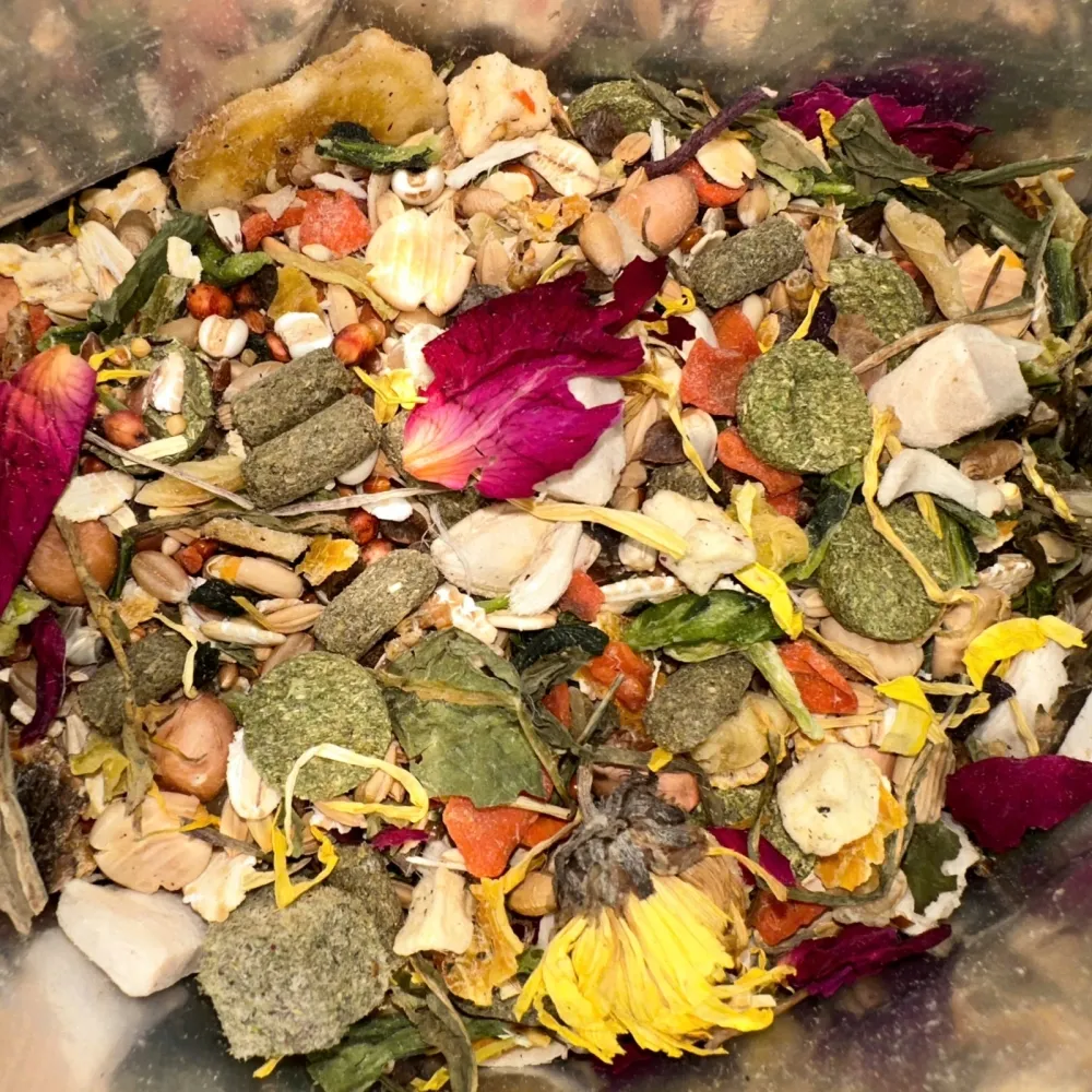 Thịt gà sấy khô, sâu bột sấy khô, tôm nước ngọt, cà rốt, cải thìa, chuối sấy, gạo Ghana, hạt cây rum, đậu phộng, cỏ linh lăng khô, lúa miến trắng, kiều mạch và lúa mạch, đậu Hà Lan ép, bồ công anh, cúc vạn thọ, hoa cúc La Mã, hoa hồng, hạt gai dầu, yến mạch, yến mạch cán, hạt bí ngô, đậu xanh, hạt hướng dương, lúa miến, lúa mạch, gạo đỏ.