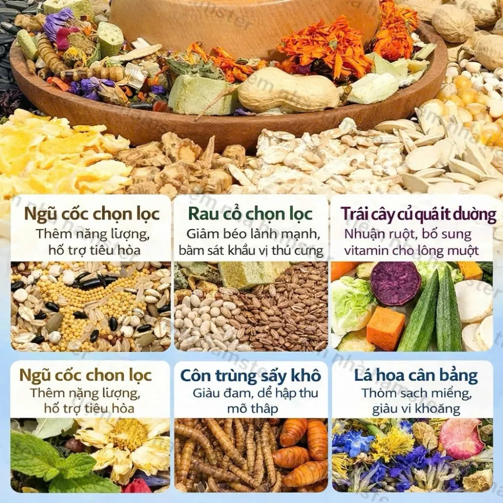 • Cỏ xanh sấy, hạt kê, đậu Hà Lan, hoa hồng, hạt lanh, yến mạch, hoa cúc, cà rốt sấy, bạc hà, atiso, hoa mâm xôi đỏ, sâu bột, yến mạch đen, lá dâu tằm, bánh đậu nành ép, đậu Hà Lan ép, đậu xanh, bột rau củ, bột đậu đỏ, đậu gà, bắp, hạt hướng dương, lúa mì, đậu phộng, hoa cúc dại, hạt lanh nâu, gạo lứt, lúa mạch, sâu lúa mạch, đậu nành, hạt tổng hợp (bắp, kê, yến mạch, hạt lanh, lúa mạch…).